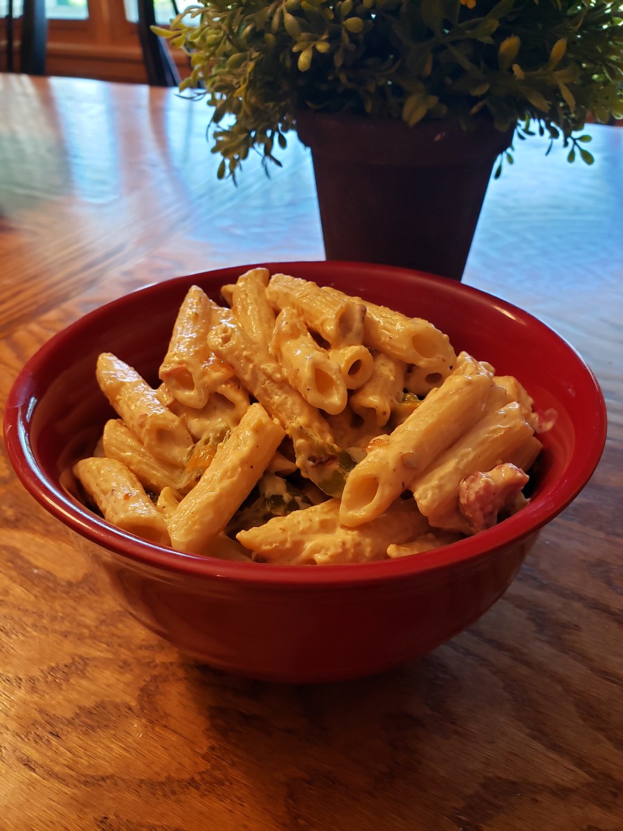 When pasta is done, drain and return the pasta to the pot. Add in the bacon and vegetable mixture. Microwave the queso dip for about 90 seconds. Add the queso dip to the pasta and toss together. Serve immediately.